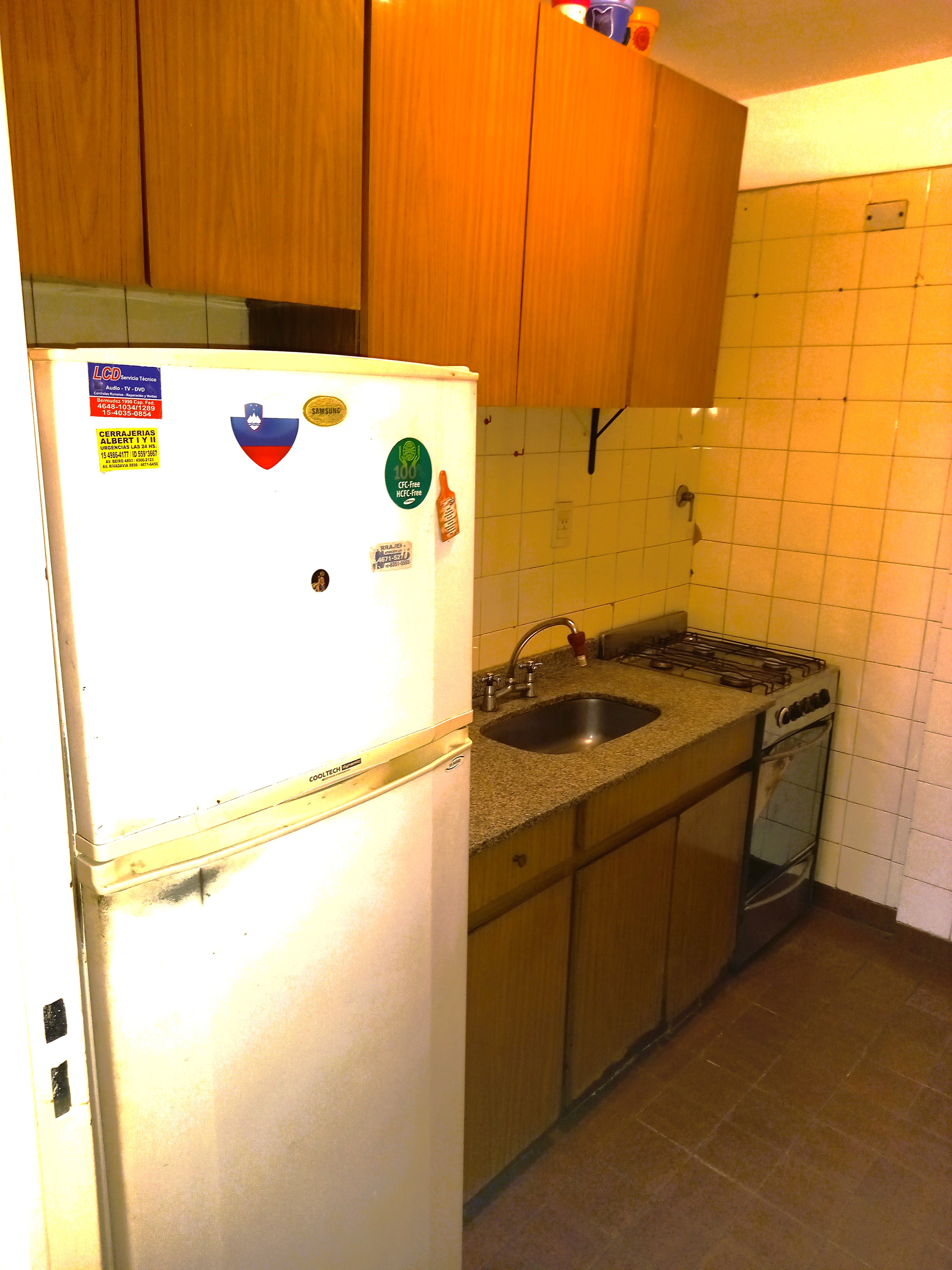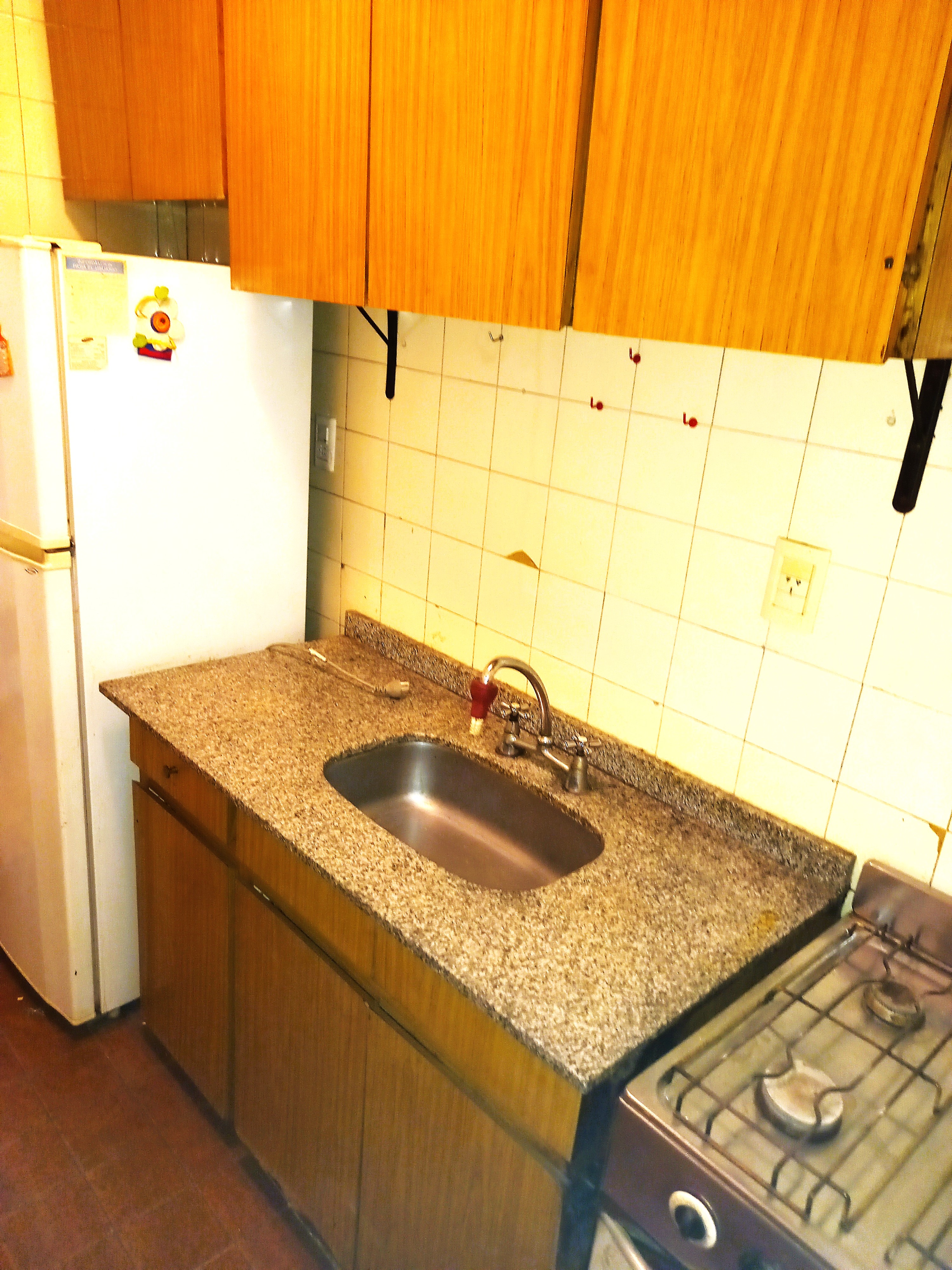 Cocina 3x2 pisos cerámicos con muebles altos y bajos